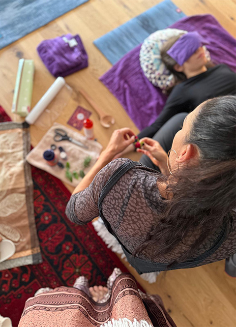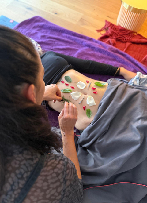 Avant le massage, le ventre se laisse enfin rencontrer. L’enveloppement aux plantes médicinales diffuse sa chaleur et sa sagesse, un souffle végétal qui caresse le corps et l’invite à se libérer. Ce premier contact ouvre l’espace, fait circuler l’énergie, et amorce doucement le mouvement de transformation. Un temps suspendu, un dialogue silencieux avec soi, où le ventre retrouve un peu de liberté.